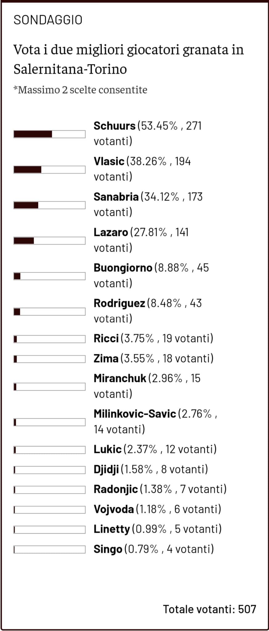 Come di consueto, dopo ogni partita di campionato del Torino, chiediamo ai lettori di Toro News, con il Toro News Award - premio che a fine stagione decreterà chi ha avuto il miglior rendimento stagionale - di votare i due migliori granata in campo dell'ultimo turno di Serie A. In seguito al pareggio per 1-1 sul campo della Salernitana, il giocatore del Torino che ha raccolto più voti è stato Schuurs con 271 preferenze, mentre alle sue spalle si è piazzato Vlasic, che si è fermato a 194. Sul gradino più basso del podio, infine, troviamo Sanabria (autore del gol dell'1-0) scelto da 173 votanti su 507 totali.