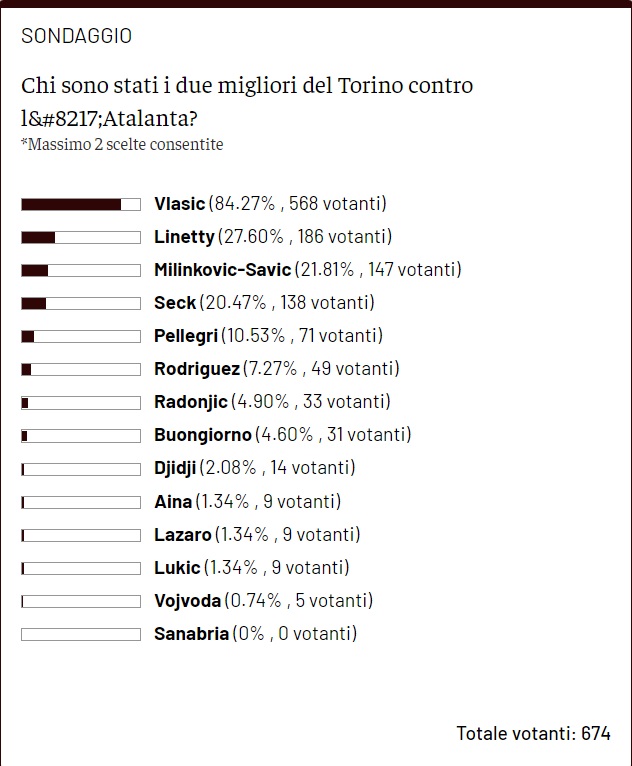 Come di consueto, dopo ogni partita di campionato del Torino, chiediamo ai lettori di Toro News, con il Toro News Award - premio che a fine stagione decreterà chi ha avuto il miglior rendimento stagionale - di votare i due migliori granata in campo dell'ultimo turno di Serie A. In seguito alla partita persa per 3-1 in casa dell'Atalanta, il giocatore del Torino che ha raccolto più voti è stato Nikola Vlasic con 568 preferenze, mentre alle sue spalle si è piazzato Karol Linetty, che si è fermato a 186. Sul gradino più basso del podio, infine, troviamo Vanja Milinkovic-Savic, scelto da 147 votanti su 674.