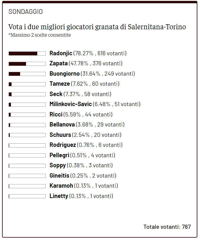 Prosegue il Toro News Award, il premio per il miglior calciatore granata che la redazione di Toro News assegna in base ai voti dei lettori. I risultati del sondaggio lanciato dopo Salernitana-Torino hanno incoronato, per il secondo weekend consecutivo, Nemanja Radonjic. Il 10 granata si è esaltato a Salerno entrando nel vivo di tutte le azioni pericolose dei granata e siglando la doppietta personale. I lettori di Toro News lo hanno premiato con ben il 78% delle preferenze. Segue Duvan Zapata, trascinatore offensivo alla seconda partita in maglia granata e selezionato dal 48% dei lettori. Al terzo posto Alessandro Buongiorno, autore del gol che ha sbloccato la partita a Salerno. Cambia la classifica del Toro News Award. Con i 5 punti da MVP, Radonjic aggancia in testa proprio Buongiorno a quota 10 punti. Schuurs si piazza al secondo posto nella graduatoria generale, seguito da Milinkovic-Savic.