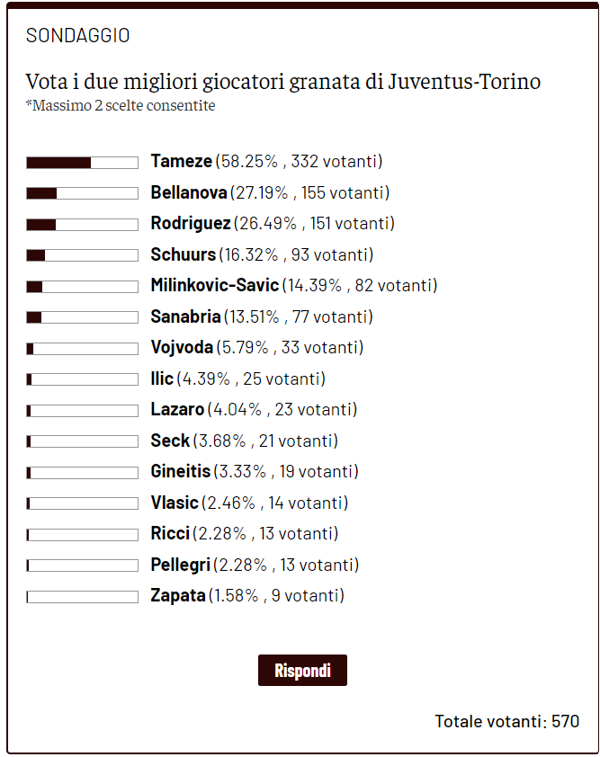 —Come si svolge questa competizione? Dopo ogni partita di campionato verrà pubblicato sul nostro sito un sondaggio, in cui chiederemo a ogni utente di indicare due voti per scegliere i due giocatori del Torino che più si sono distinti in quel singolo match. Ai calciatori, in base al numero di voti, verranno attribuiti dei punteggi: 5 punti al più votato, 3 punti al secondo più votato, 1 punto al terzo. Al termine della stagione, il calciatore del Torino che risulterà avere conquistato più punti si aggiudicherà il Toro News Award 2023/2024 succedendo nell’albo d’oro ad Antonio Sanabria, campione dell'edizione 2022/2023. I sondaggi avranno la durata di 24 ore. (NOTA BENE: Nella visualizzazione dei risultati, poiché ogni lettore ha due preferenze, le percentuali si riferiscono al numero totale dei votanti: ad esempio, se un giocatore coglie il 50% dei voti, significa che è ricaduto in una delle due preferenze della metà dei votanti totali). Nella visualizzazione dei risultati, poiché ogni lettore ha due preferenze, le percentuali si riferiscono al numero totale dei votanti: ad esempio, se un giocatore coglie il 50% dei voti, significa che è ricaduto in una delle due preferenze della metà dei votanti totali).