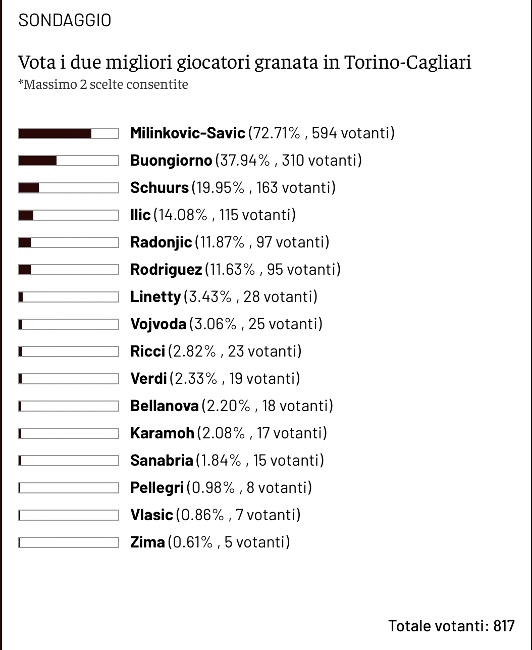 —Come si svolge questa competizione? Dopo ogni partita di campionato verrà pubblicato sul nostro sito un sondaggio, in cui chiederemo a ogni utente di indicare due voti per scegliere i due giocatori del Torino che più si sono distinti in quel singolo match. Ai calciatori, in base al numero di voti, verranno attribuiti dei punteggi: 5 punti al più votato, 3 punti al secondo più votato, 1 punto al terzo. Al termine della stagione, il calciatore del Torino che risulterà avere conquistato più punti si aggiudicherà il Toro News Award 2023/2024 succedendo nell’albo d’oro ad Antonio Sanabria, campione dell'edizione 2022/2023. I sondaggi avranno la durata di 24 ore. (NOTA BENE: Nella visualizzazione dei risultati, poiché ogni lettore ha due preferenze, le percentuali si riferiscono al numero totale dei votanti: ad esempio, se un giocatore coglie il 50% dei voti, significa che è ricaduto in una delle due preferenze della metà dei votanti totali). Nella visualizzazione dei risultati, poiché ogni lettore ha due preferenze, le percentuali si riferiscono al numero totale dei votanti: ad esempio, se un giocatore coglie il 50% dei voti, significa che è ricaduto in una delle due preferenze della metà dei votanti totali).