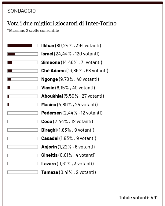 Inizia la nuova stagione di Serie A per il Torino e con essa torna anche, come di consueto, il Toro News Award, premio che a fine stagione decreterà chi ha avuto il miglior rendimento stagionale. Come di consueto, chiediamo ai lettori di Toro News di votare i due migliori granata in campo dell'ultimo turno di Serie A. In seguito alla sconfitta esterna contro l'Inter di Cristian Chivu per i lettori di Toro News ad aggiudicarsi il premio di migliore in campo tra le file granata è stato Ilkhan con l' 80,24% di voti a favore. Al secondo posto con il 24,44% dei voti troviamo Franco Israel, il nuovo acquisto granata che grazie ad un'ottima prestazione tra i pali si aggiudica il podio. Infine con il 14,46% di voti a favore troviamo in terza posizione Giovanni Simeone.