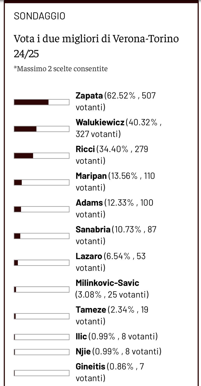 Prosegue il Toro News Award, il premio per il miglior calciatore granata che la redazione di Toro News assegna in base ai voti dei lettori. Come di consueto, chiediamo ai lettori di Toro News di votare i due migliori granata in campo dell'ultimo turno di Serie A. Dopo la vittoria in trasferta contro il Verona, per i lettori di Toro News ad aggiudicarsi il premio di migliore in campo tra le file granata è stato Duvan Zapata, il quale ha fornito una prestazione di alto livello e ha messo a segno la seconda rete per i granata. Il colombiano ha guadagnato il 62,5% dei voti a favore (507) staccando di non molto Walukiewicz, che ha ottenuto il 40,3% dei voti (327), segue poi Ricci con una percentuale di 34,4 (279 votanti).