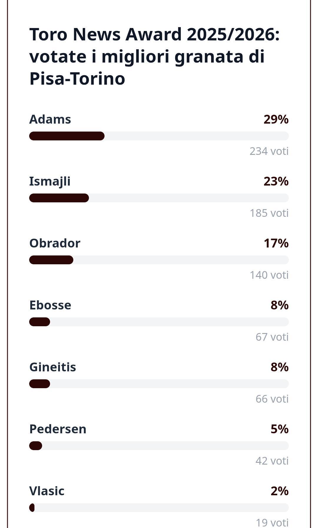 Il Toro vince di misura nella trasferta all'Arena Garibaldi contro il Pisa. Decisiva la rete di Ché Adams su assist di Pedersen all'80' per lo 0-1 finale. Lo scozzese, dunque, sblocca una partita che fino a quel momento era stata abbastanza povera di occasioni e ricca di errori da parte di entrambe le squadre. I granata allungano così a +9 sulla zona retrocessione e blindano la propria salvezza. Abbiamo chiesto a voi lettrici e lettori di Toro News di votare i due migliori granata della sfida. Ché Adams è stato il migliore dei suoi contro il Pisa. Ben il 29% dei votanti l'ha indicato come migliore contro i toscani. Segue Ardian Ismajli che ha ricevuto il 23% dei voti. Infine Rafa Obrador chiude il terzetto e ottiene il 17%. Nella classifica generale: Adams sale a 28 punti e si avvicina al podio, Obrador raggiunge Israel a quota 8 e Ismajli si porta al pari di Coco a 5 punti.