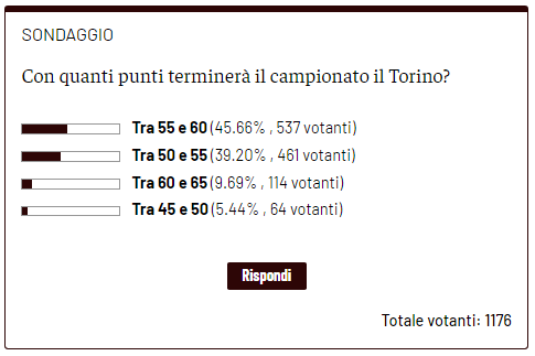 Il 45.66% dei votanti, pari a 537 sui 1176 totali, ha scelto l'opzione tra 55 e 60 punti. A seguire 461 voti per l'alternativa tra 50 e 55 punti, mentre molto più scarsa è la percentuale di persone che hanno votato per l'opzione tra 60 e 65 punti (il 9.69%) e tra 45 e 50 punti (il 5.44%). Dunque né troppa positività e né troppa negatività tra il tifo granata.