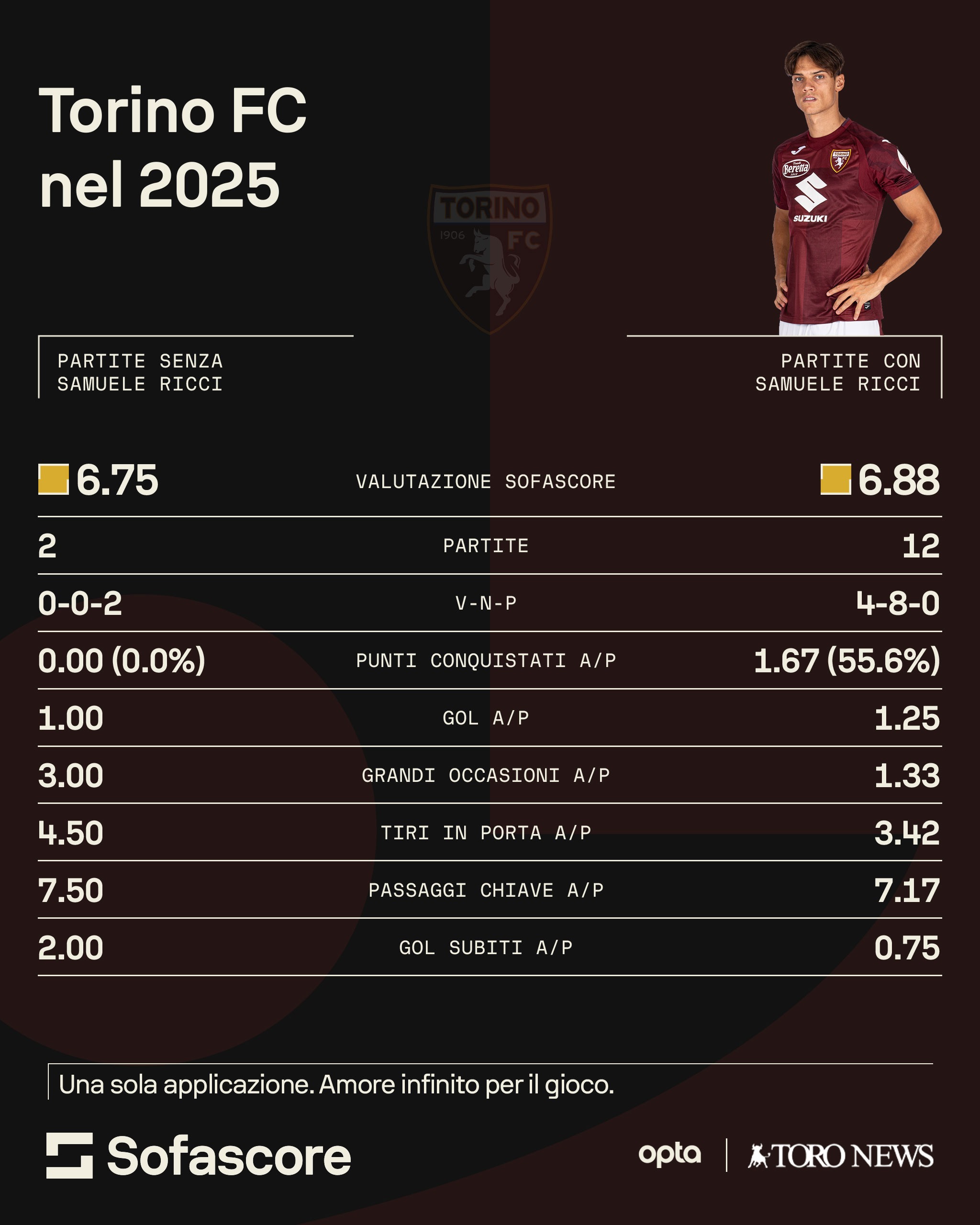 —Andando più nel profondo dell'analisi, viene da chiedersi: cambia così tanto la performance del Torino con o senza il suo capitano in campo? Per quel che riguarda la fase offensiva, secondo i dati riportati da Sofascore.com, la risposta è sorprendente: paradossalmente, i granata, nel 2025, producono di più se Ricci non gioca. Il Toro, senza Ricci, infatti, crea una media di 3 occasioni a partita e di 4,5 tiri in porta, mentre con lui in campo ci si assesta a 1,33 occasioni per gara e a 3,42 tiri verso lo specchio. Leggermente meglio quando Ricci è presente per quel che riguarda il dato relativo ai gol: con lui in campo la media è di 1,25 gol segnati per gara, senza è solo di un gol per partita.