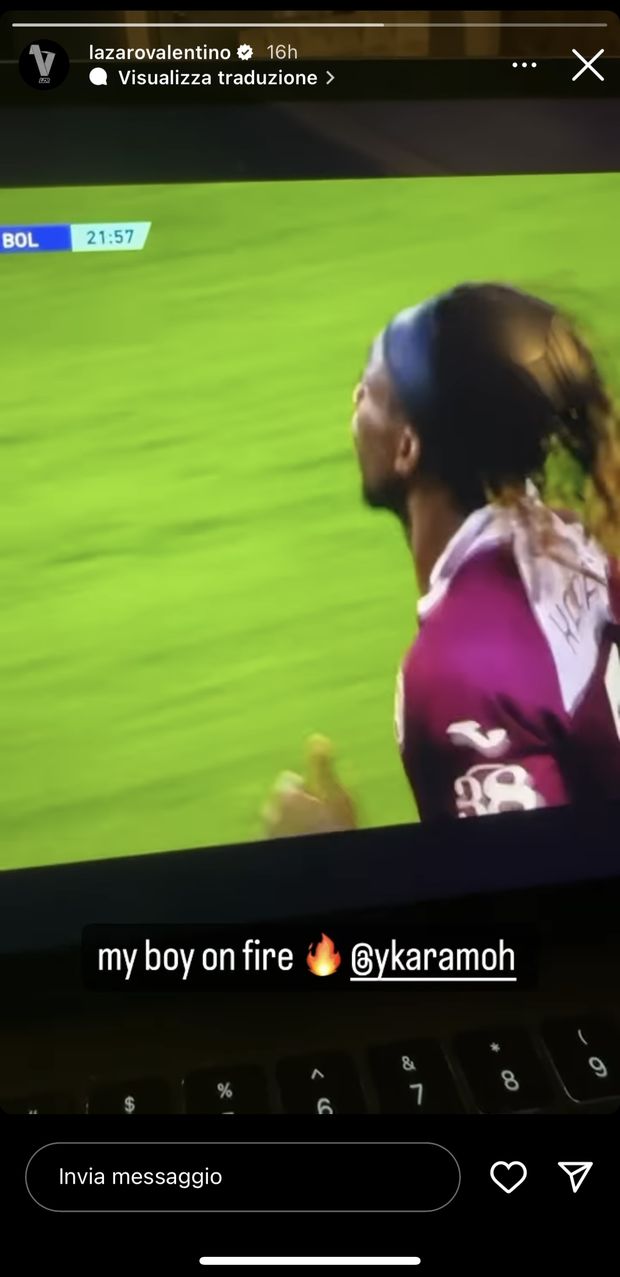 Distante fisicamente, ma presente da casa e come tifoso: Valentino Lazaro, ancora fermo ai box per infortunio, ha seguito la gara da primo sostenitore del gruppo. A dimostrazione, la storia pubblicata dal giocatore nei confronti di Karamoh: “my boy on fire” sono le parole che il granata dedica all’attaccante autore del gol vittoria.