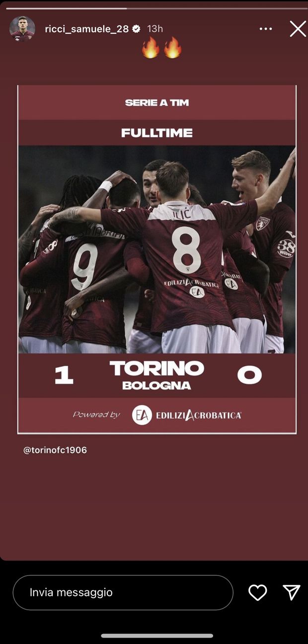 Anche Samuele Ricci ha seguito la squadra da fuori: il centrocampista granata, in seguito all’ammonizione conquistata durante il Derby, ha dovuto scontare una giornata di squalifica. Per festeggiare la vittoria, però, l’ex Empoli ha pubblicato una storia con due fuochi, simbolo di forza e carica della squadra.