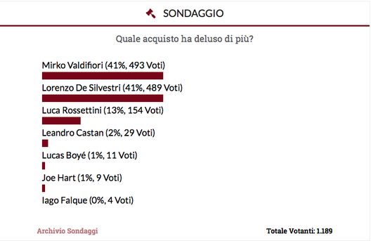 "L'ultima questione proposta riguardava, invece, la new entry che - sino a questo momento - aveva deluso le attese dei tifosi. I 1189 granata che si sono cimentati in questo sondaggio, hanno votato per il 41% Valdifiori, e per un altro 41% De Silvestri, facendo sì che siano gli ex di Napoli e Sampdoria i giocatori da cui ci si aspetta nettamente di più. Un 13% anche per Rossettini, mentre davvero irrisorie le percentuali riguardanti Castan e Joe Hart.
