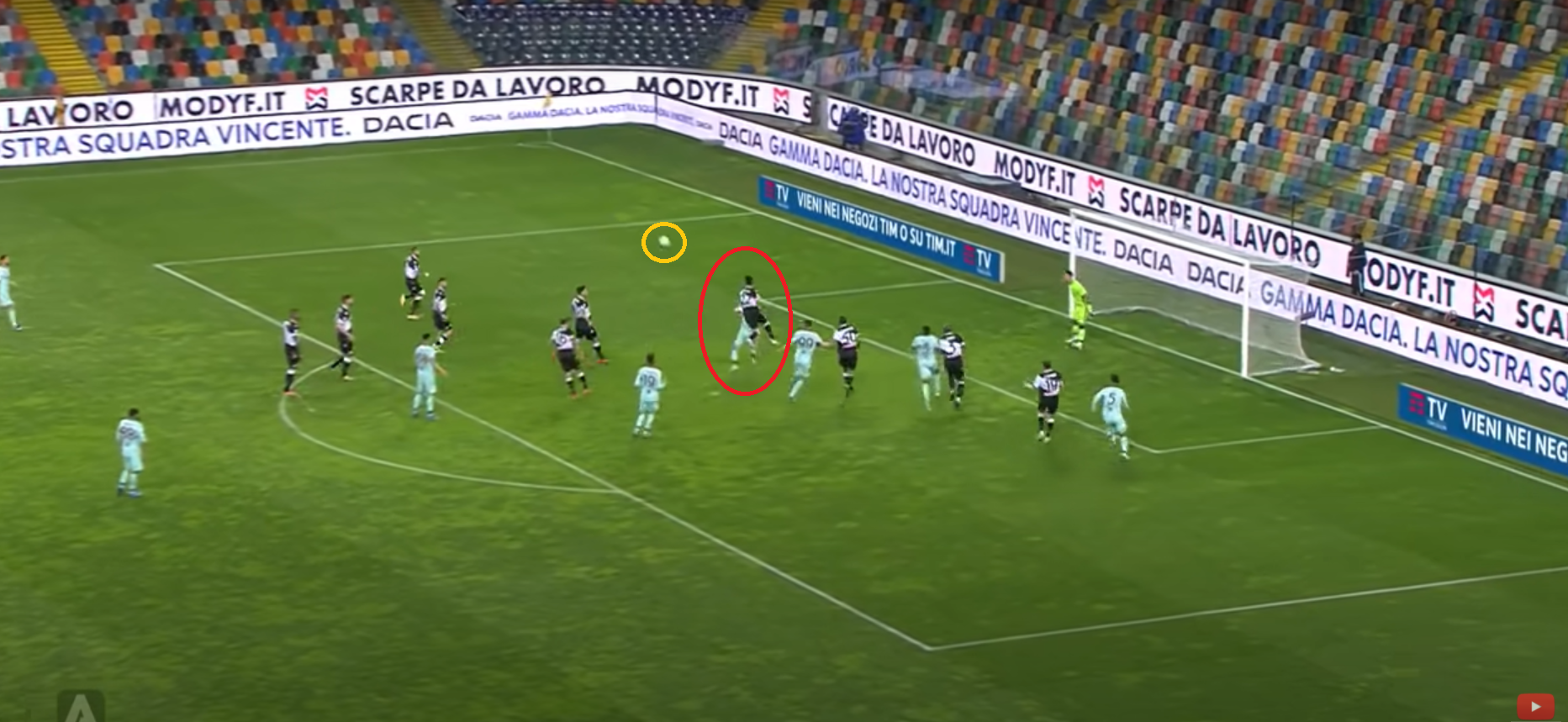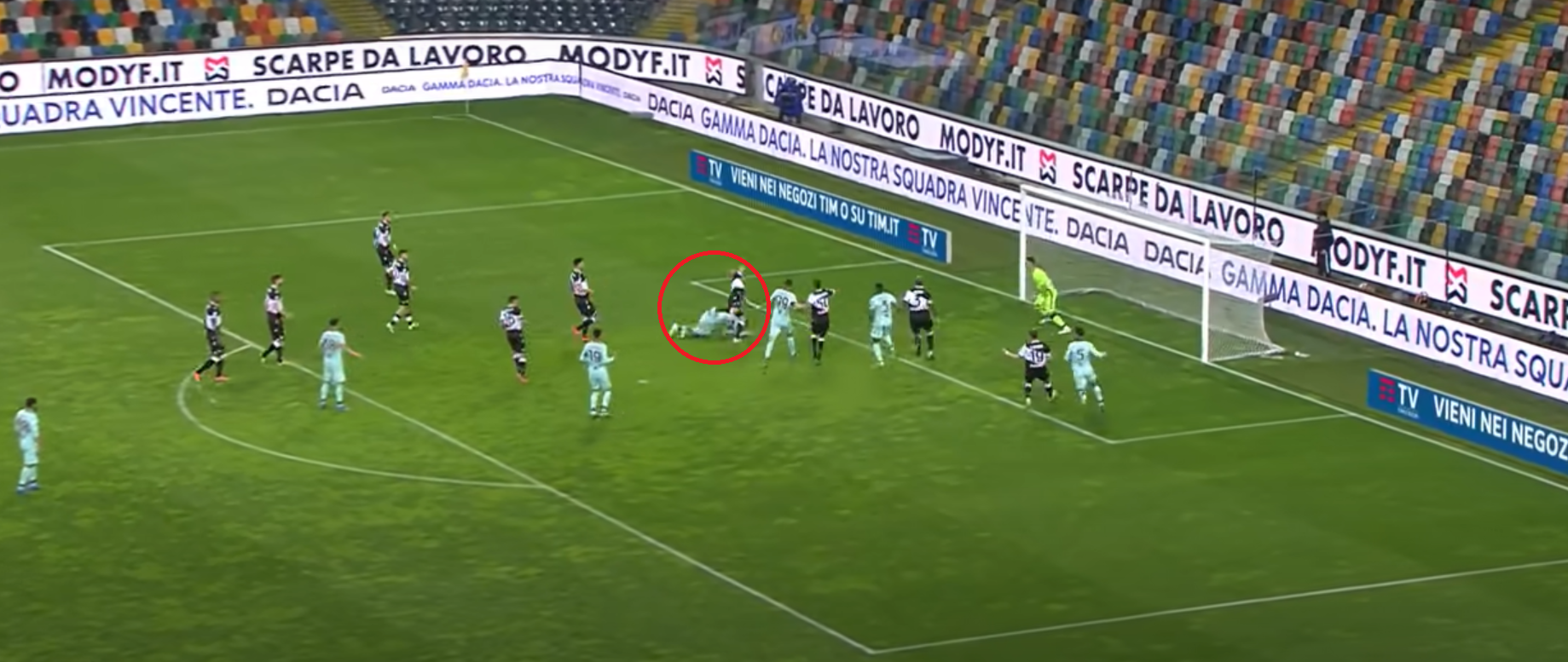 Belotti è bravo a prendere il tempo ad Arslan, suo marcatore, prima ancora che parta il pallone. Il Gallo taglia dietro la barriera, tenendo il centrocampista dell’Udinese alle sue spalle.
