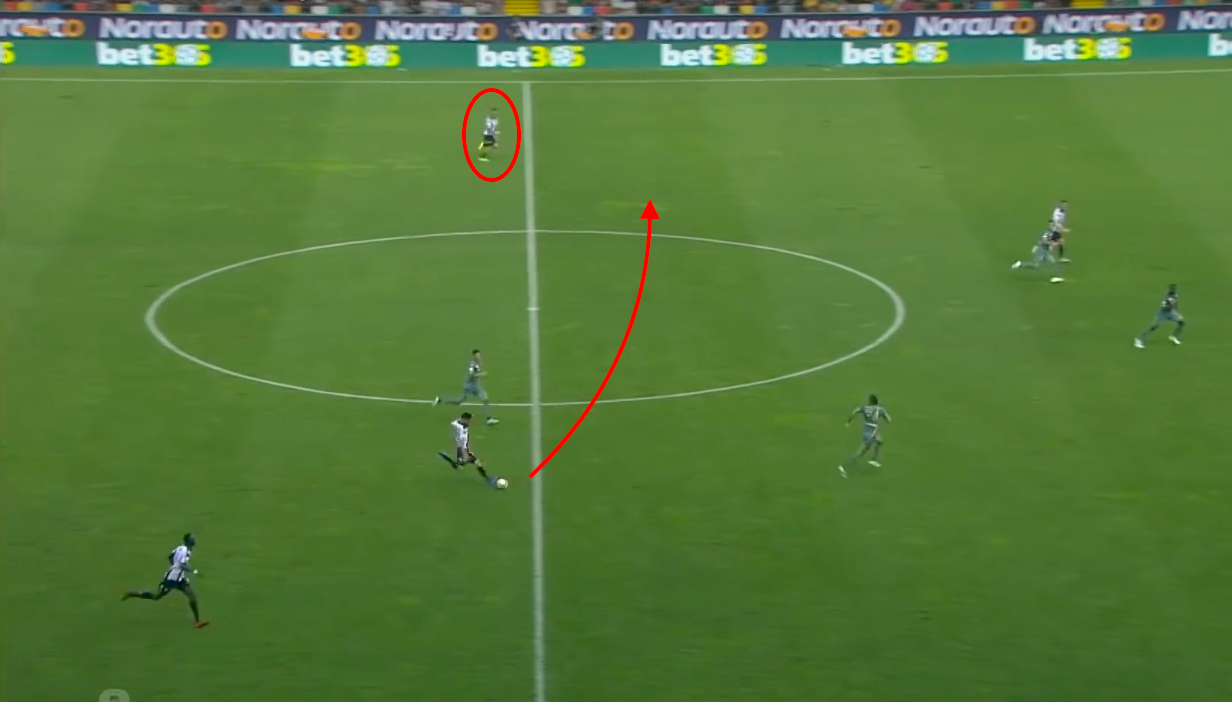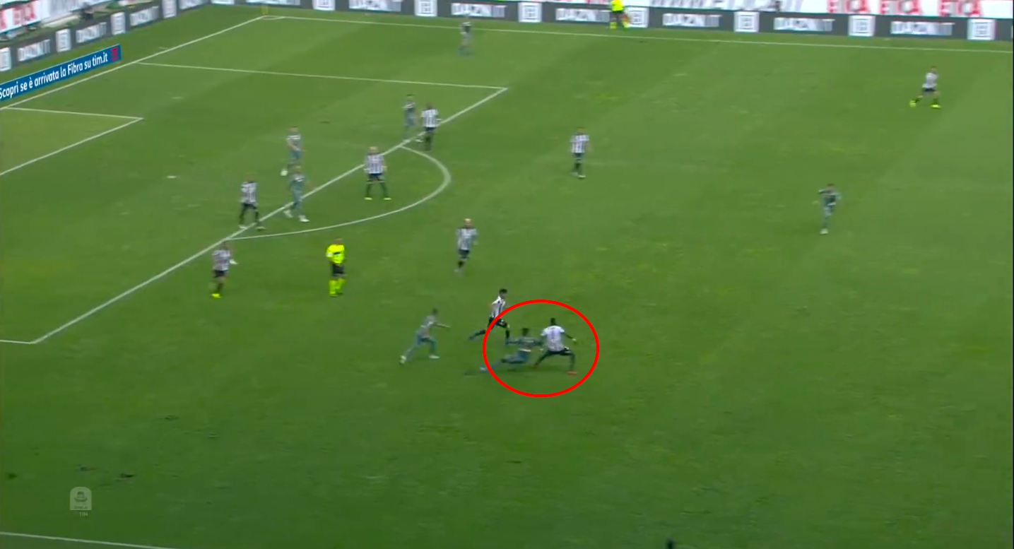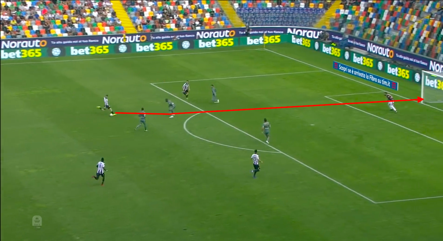Come ormai noto, il goal dell'Udinese nasce da un recupero palla di Fofana sulla trequarti difensiva. Dopo un contrasto energico con Meité, il numero 6 friulano si disinteressa del pallone e trascina il giocatore del Toro a terra, ma l'arbitro non fischia. Pussetto dà il via al contropiede dei bianconeri, tagliando il campo in orizzontale e poi servendo Rodrigo De Paul. A questo proposito va detto che l'esterno destro dell'Udinese dopo aver ricevuto palla da Fofana trova troppo spazio per vie centrali: l'altro mediano granata, Baselli, non riesce a tamponare in quanto si trova in posizione leggermente decentrata sull'inizio della ripartenza.