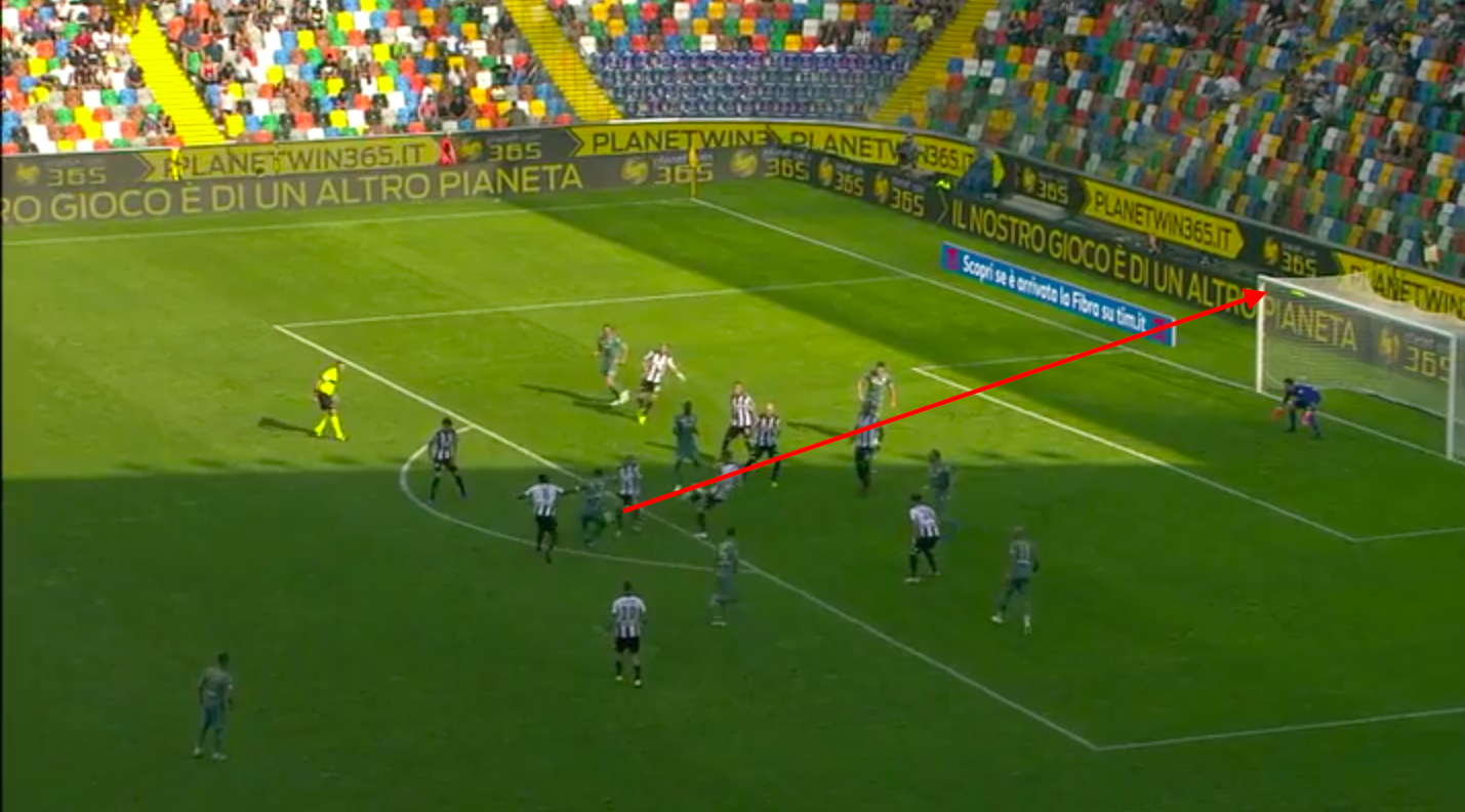 Il fantasista argentino si accentra in campo aperto puntando la difesa a tre del Toro. Moretti, Izzo e Nkoulou arretrano verso la propria porta fino al limite dell'area: in quel momento Nkoulou esce verso il pallone, e De Paul calcia. Il tiro è basso e forte, ma centrale, e infatti Sirigu fa un passo verso sinistra. Il difensore camerunese del Torino però, devia il pallone rendendolo imparabile per Sirigu che lo guarda insaccarsi alla propria destra.
