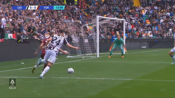 La scelta dell'ex Atalanta si rivela saggia perché alle sue spalle c'è Aina tutto solo che riceve palla dal compagno e calcia di prima intenzione con il piatto sinistro trovando l'angolino alla destra di Silvestri, il portiere dell'Udinese. Nell'immagine 5 si può vedere il momento in cui l'esterno nigeriano prende la mira e calcia trovando il gol del vantaggio dopo poco meno di un quart'ora.