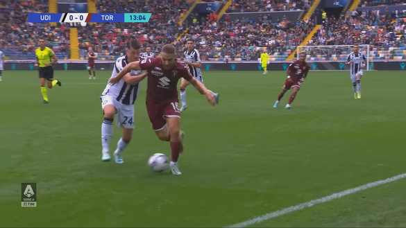 Questo compagno di Lazaro è Vlasic che riceve palla in posizione molto laterale e con una finta riesce a mandare a vuoto l'intervento di Samardzic (immagine 2). Il croato del Torino riesce a prendere velocità e a dirigersi verso l'area di rigore.