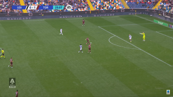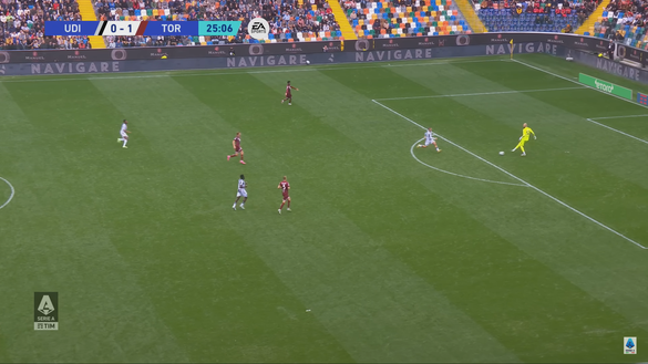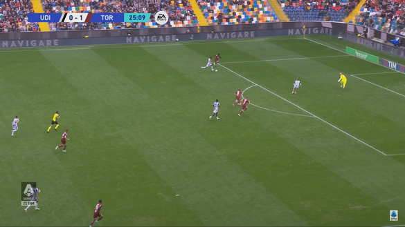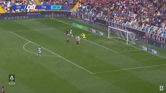 Il risultato è il più semplice dei gol con Deulofeu che da due passi spinge senza problemi la palla in rete dopo aver ricevuto il passaggio di Udogie; allo spagnolo basta fare in modo di restare dietro alla linea della palla per non finire in off-side. I friulani trovano così il pareggio grazie ad un vero e proprio regalo della retroguardia granata.