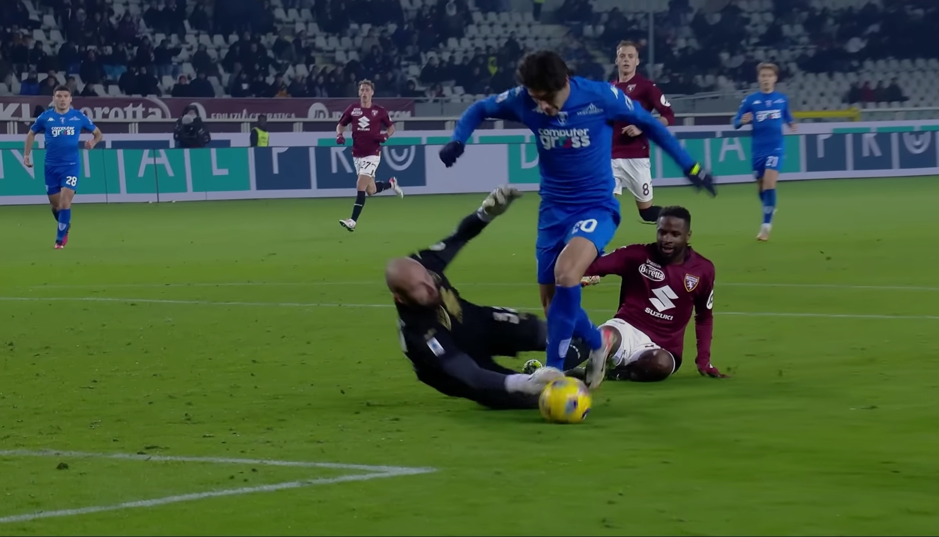 Nella pochezza offensiva dell'Empoli, una squadra che fatica a trovare la via della rete, Vanja riesce comunque a diventare protagonista con una grande giocata e riscattando parzialmente le errate letture sopracitate. Destro fa la sponda per l'inserimento di Cancellieri. L'ex Verona e Lazio brucia in velocità un Tameze in difficoltà e si presenta a tu per tu con il serbo. Bravissimo Vanja a mantenere la freddezza in una situazione così delicata. Ottima la scelta di tempo dell'intervento sul pallone, che come si vede viene preso in pieno. Anche gli stessi giocatori dell'Empoli non protestano con il direttore di gara.
