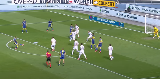 Tre minuti dopo arriva il pari del Verona. Gli scaligeri ripartono a campo aperto e Lasagna sulla destra si accentra e punta Buongiorno.