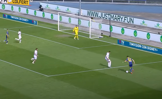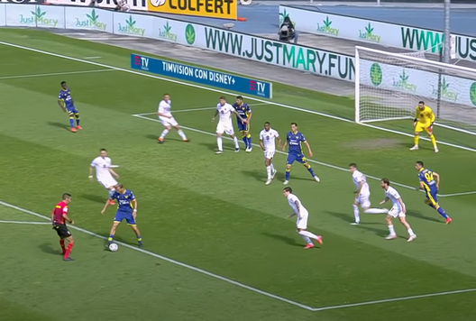 Sul centrocampista scaligero arrivano in ritardo sia Lukic che Baselli. Il serbo è molto leggere nel suo intervento e facilità di fatto la giocata di Barak, che appoggia per Dimarco al limite. Qui è bravo l'esterno del Verona, che con l'esterno manda la palla in buca d'angolo riuscendo a tenere la palla rasoterra pur avendo il corpo in posizione totalmente sbagliata. Per segnare poteva solamente colpire la palla in quel modo. Gran gol e gran gesto tecnico di Dimarco, che punisce ancora una volta il Torino.