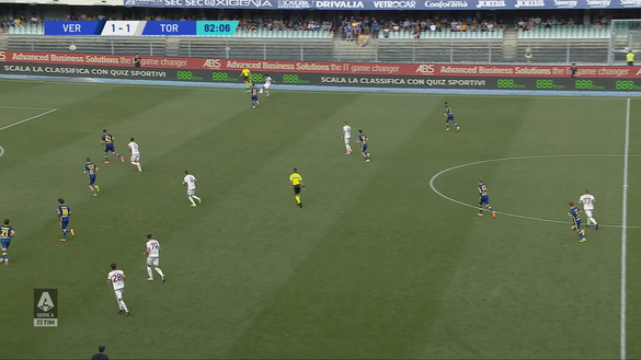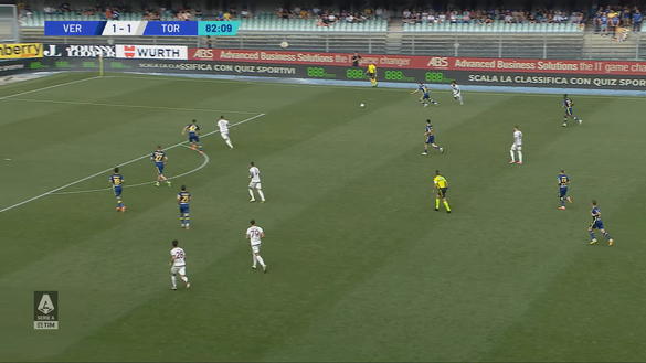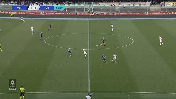 All'83' minuto il Torino si porta in vantaggio e tutto nasce da un bel lancio di Dellavalle che taglia tutto il campo. Il giovane difensore classe 2004, capitano della Primavera granata, ha dimostrato subito la sua tecnica e la sua personalità in questo suo esordio in Serie A. Nell'immagine 1 si vede con il numero 25 intento a cambiare gioco con un bel rinvio preciso.