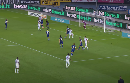 A questo punto l'austriaco ha spazio per calibrare bene il cross, mentre in area di rigore ha preso bene posizione Zapata.