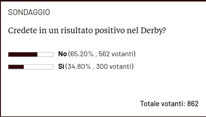 Il Derby della Mole è alle porte ed il Torino ci arriva, come spesso accade, da sfavorito. Una partita da sempre complicata per i granata, che, quasi costantemente negli ultimi anni, sono usciti sconfitti, e spesso subendo il gol decisivo nei minuti finali. Alle luce quindi delle esperienze passate e della situazione attuale in casa Toro e Juve, vi abbiamo voluto chiedere: credete in un risultato positivo (pareggio o vittoria) del Toro nel Derby? Hanno partecipato al sondaggio in 862 e l'esito è stato il seguente. 562 votanti (il 65,2% del totale) hanno risposto di no alla domanda, mentre solamente in 300 (34,8% del totale) hanno risposto di sì. E' quindi evidente come quasi due lettori su tre si aspettino una sconfitta granata nella stracittadina torinese. La storia recente e passata di questo incontro, il momento di campionato difficile del Torino, con le sconfitte con Udinese e Venezia, il calciomercato juventino, che con gli acquisti di Vlahovic e Zakaria sembra aver risolto i problemi dei bianconeri della prima parte di stagione, oltre ad un pizzico di inevitabile scaramanzia, hanno probabilmente portato alla definizione di questo risultato. In ogni caso, domani - venerdì 18 febbraio - parlerà il campo, ma, per adesso, nelle ore che precedono il derby, le sensazioni dei tifosi granata non sembrano essere positive.
