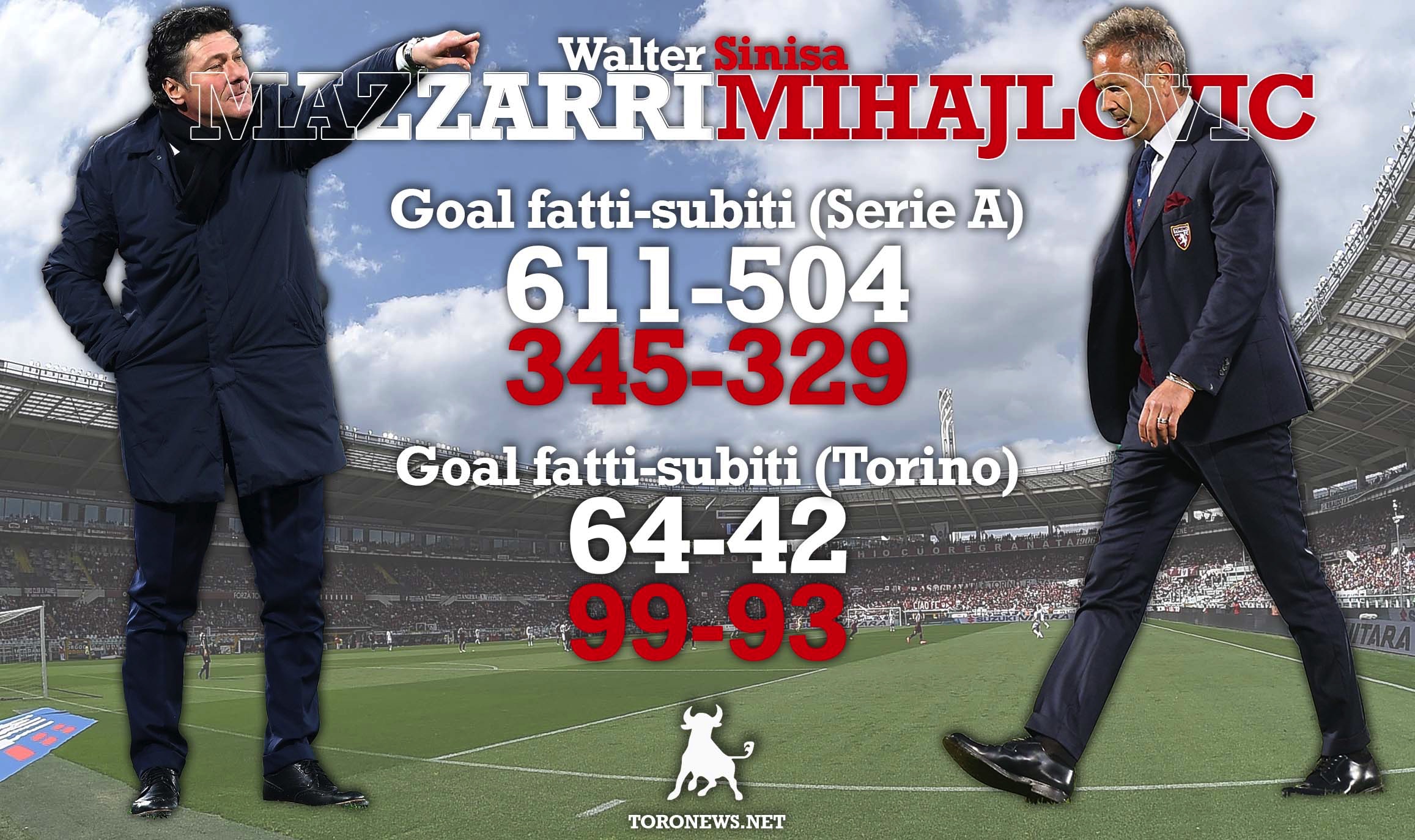 Segnano di più le squadre di Mazzarri o quelle di Mihajlovic? In questo caso i dati ci restituiscono indicazioni differenti a seconda del periodo considerato. Prendendo i numeri totali riferiti alle partite di Serie A, le squadre di Mazzarri hanno segnato 611 goal mentre quelle di Mihajlovic 345. Anche a livello di media goal quindi, l'allenatore del Toro supera il suo predecessore: 1,42 contro 1,37 a partita. Considerando invece l'esperienza granata nell'era Mihajlovic sono stati realizzati 99 goal contro i 64 dell'era Mazzarri. Nonostante le 10 partite in meno, anche la media goal è superiore: quella del serbo è di 1,7 mentre quella di Mazzarri 1,33. Ben diverso il dato sulla differenza reti: il Toro di Mazzarri (così come tutte le squadre allenate in Serie A) è molto più solido di quello di Mihajlovic e ha incassato ben 51 goal in meno. Per questo la differenza reti del toscano è di +22 mentre quella di Miha solamente di +6 (In carriera: Mihajlovic +16, Mazzarri +107).