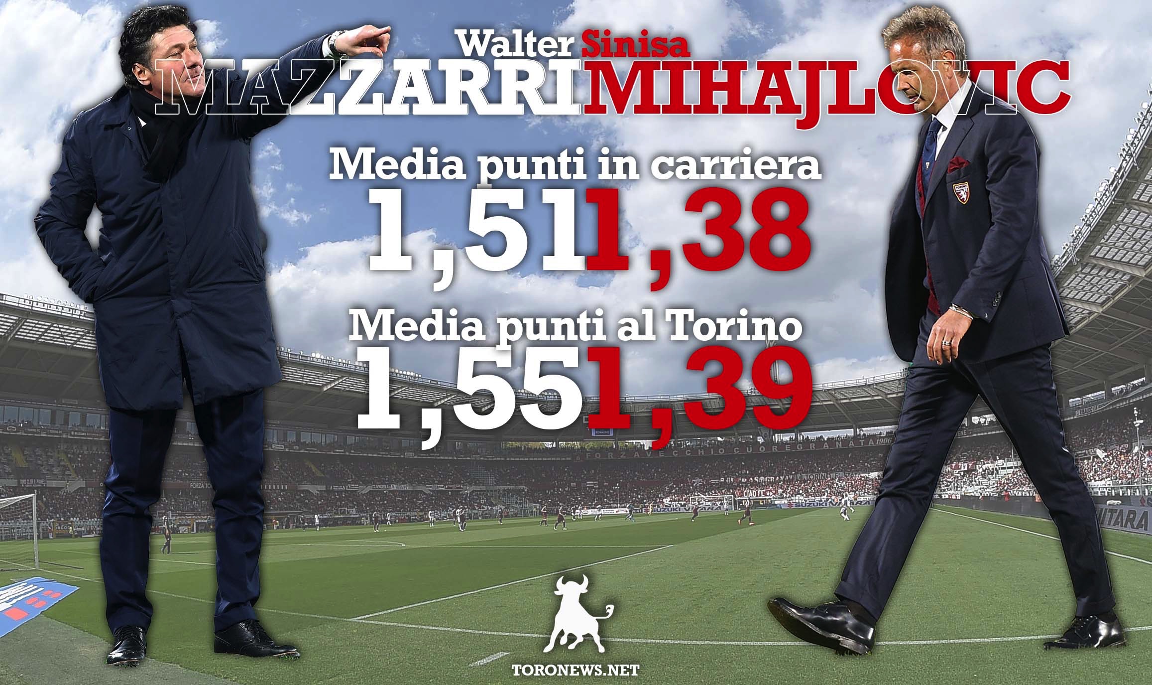 Le statistiche sulla media punti dicono che entrambi gli allenatori, alla guida del Torino, viaggiano con una media leggermente più alta rispetto al resto della carriera in massima serie (+ 0,01 Miha, +0,04 Mazzarri). Mazzarri con il Torino ha una media di 1,55 punti a partita a fronte della media dell'1,39 di Mihajlovic. Considerando tutta la carriera degli allenatori il distacco si assottiglia di poco: Mazzarri 1,51 e Mihajlovic 1,38.