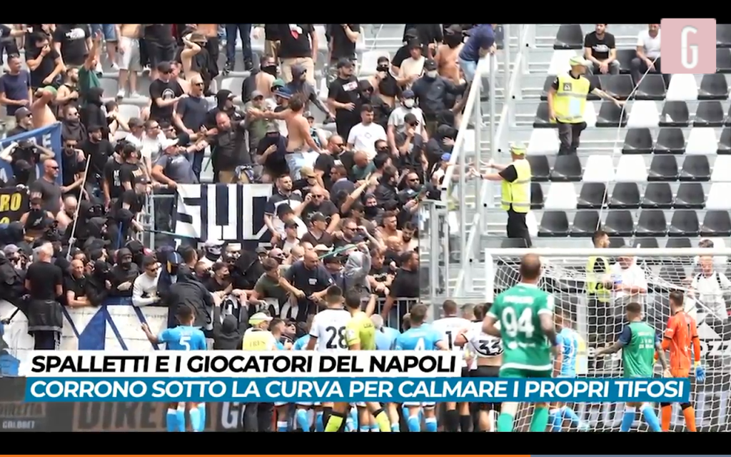 Spezia-Napoli sospesa per 12 minuti dopo il lancio di fumogeni e scontri tra ultrà in curva: le immagini.