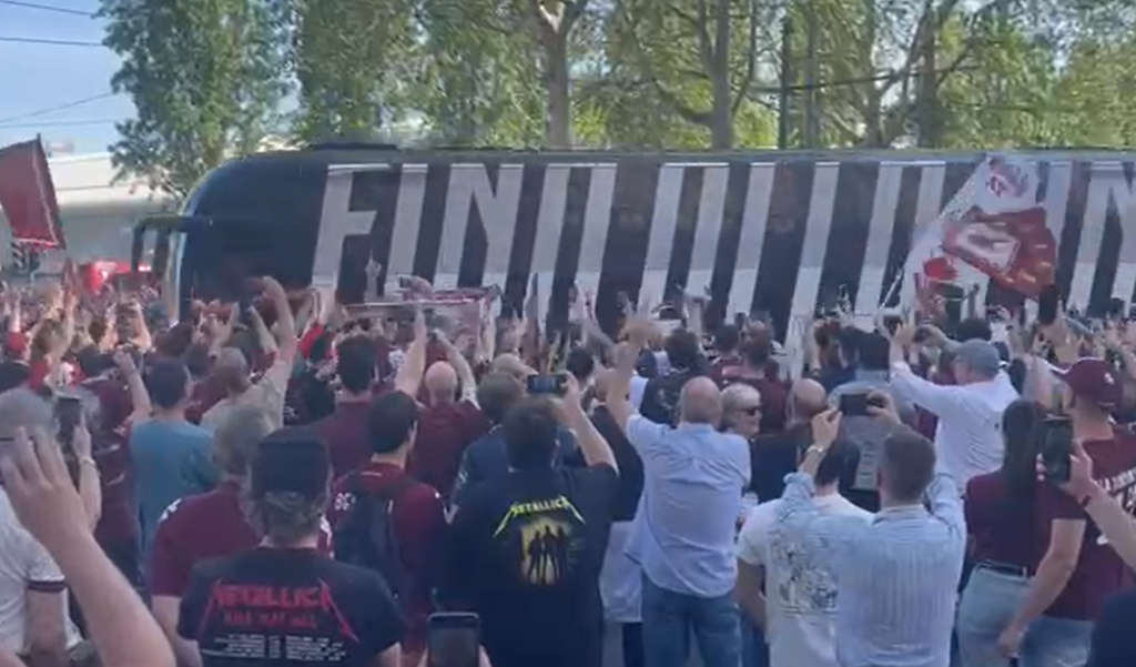 Le immagini dell'arrivo allo stadio granata del pullman della Juventus per il derby: tantissimi fischi e insulti per Allegri e i suoi ragazzi